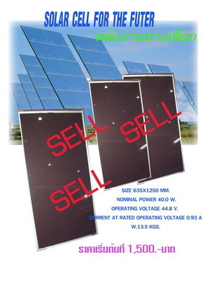 แผ่น พลังงานแสงอาทิตย์ ขายราคาตามสภาพ หนึ่งแผ่น สามารถจ่ายกระแส ไฟฟ้า ได้ 50 วัตต์ เก็บกระแสไฟฟ้าได้ 60โวลล์ มีให้เลือกหลายแผ่น สนใจติดต่อได้ที่ คุณ จิรกร ที่ เบอร์โทร 02-2947066-74 หรือ มือถือ 081-7627993