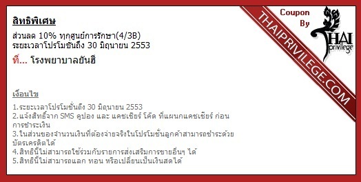 แจกฟรีบัตรส่วนลด 10% ใช้ได้ทุกศูนย์การรักษาที่โรงพยาบาลยันฮีคะ โดยนำไปยื่นที่แคชเชียร์ก่อนการชำระเงินได้เลยตะ คุณสามารถโหลดและพิมพ์คูปองจากไฟล์คูปองที่แนบกระทู้นี้หรือไปโหลดเองได้ที่ http://www.thaiprivilege.com">www.thaiprivilege.com