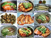 หอยแมลงภู่อบ/เผา ปูนึ่งซีอิ้ว กุ้งอบเกลือ และปลากระพงเผาเกลือพร้อมน้ำจิ้มรสเด็ด