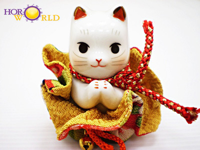 เซรามิคแมวพนมมืออยู่ในถุงผ้า คนญี่ปุ่น มีความเชื่อว่าแมวเป็นสัตว์นำโชค จึงมีการทำเป็นแมวนางกวักที่เราได้เห็นๆ กันทั่วไป