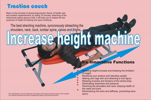 ไม้ต้องกลัวเตี้ยให้เป็นปมด้อยอีกต่อไปแล้ว นวัตกรรมใหม่ของการเพิ่มความสูงโดยใช้เตียงยืดตัวซึ่งเป็นที่นิยมในหลายประเทศในขณะนี้ เป็นอุปกรณ์สำหรับยืดตัวทำให้ตัวสูงขึ้น สูงขึ้น หากทำอย่างต่อเนื่อง โดยใช้หลักการเดียวกับการโหนบาร์ สามารถช่วยดึงและยืดตัวให้เราสูงขึ้นสูงขึ้นจนเพื่อนๆสงสัย สูงเร็วและเห็นผลจริง ! อย่างเห็นได้ชัด ใช้งานง่ายนอนดูทีวีอยู่กับบ้านก็ทำได้ ทำเพียงวันละ 15-20 นาที แถมยังช่วยแก้อาการปวดหลังปวดคอเนื่องจากการกดทับของกระดูกทับเส้นประสาท เครื่องยืดตัวนี้จะช่วยบำบัดอาการปวดหลัง คอ ไหล่และขา จากการทำกิจวัตรประจำวันต่างๆ เช่น ยกของหนัก นั่งทำงานนานๆ นั่งขับรถ นานๆอยู่เป็นประจำ หรือเล่นกีฬาที่ใช้กล้ามเนื้อด้านเดียวเป็นหลัก เช่น กอล์ฟ เทนนิส โบว์ลิ่ง กิจกรรมเหล่านี้ทำให้กล้ามเนื้อเกิดอาการเครียด เกร็ง หรืออักเสบและทำให้เกิดแรงกดทับบนหมอนรองกระดูกเพิ่มมากขึ้นในระดับหนึ่ง ทำให้กดทับเส้นประสาทเป็นผลทำให้เกิดอาการปวดเรื้อรัง ปวดร้าวด้านใดด้านหนึ่ง เครื่องยืดตัว ช่วยบำบัดอาการโดยหลักของการยืดหมอนรองกระดูกและกล้ามเนื้อในเวลาเดียวกัน เช่นเดียวกับการทำกายภาพบำบัดในโรงพยาบาล ให้ผลลดแรงกดบนหมอนรองกระดูกและลดความเครียดของกล้ามเนื้อได้อย่างรวดเร็ว ช่วยบำบัดให้ค่อยๆดีขึ้นจนไม่จำเป็นต้องผ่าตัดหลังมาหลายรายแล้ว นอกจากนั้นยังให้ประโยชน์จากศาสตร์ของการจัดเรียงกระดูกที่เรียกว่าไคโรแพรกติก (Chiropractic) ที่ช่วยให้แนวของกระดูกสันหลังตรงขึ้น ทำให้บุคลิกท่าทางดีขึ้น ใช้ได้กับทุกคนในครอบครัว เราจำหน่ายเครื่องยืดตัวนี้ในราคาไม่แพงเนื่องจากเราพยายามลดค่าใช้จ่ายทางการตลาดลง จากราคา 12,500 บาท ลดลงเหลือ 8,900 บาท สอบถามเพิ่มเติม 02 9576421 หรือเบอร์มือถือ 087 7153003