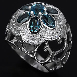 ลักษณะ : แหวนเงินชุบทองคำขาวประดับพลอยโทปาส สีฟ้าลอนดอน เจียรทรงรูปไข่และกลม น้ำหนักพลอย 4.01 กะรัต ขนาดพลอย 6x4xมม. 5 ชิ้น,ทรงกลม 5x5xมม. 1 ชิ้น ล้อมด้วยซัฟไฟร์สีขาวขนาด 1.2x1.2xมม.84 ชิ้น แบบสวยหรู สง่าใส่ได้ทุกโอกาส งานฝีมือช่างจิวเวลลี่จันทบุรี ตัวเรือนเป็นเงินชุบทองคำขาวน้ำหนักเงิน 10.77 กรัม