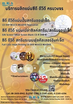 เอลริชให้บริการ ปั๊มซีดี ปั๊มดีวีดี ไรท์ซีดี ไรท์ดีวีดี พิมพ์ซีดี ก็อปปี้ซีดี อัดซีดี ฉีดแผ่นซีดี มินิซีดี มินิดีวีดี ซีดีการ์ด ดีวีดี5 ดีวีดี9 พร้อมบริการงานพิมพ์ ปกซีดี แพคเกจซีดี ดิจิแพค และสิ่งพิมพ์อื่นๆโดยให้บริการครบวงจร รับประกันคุณภาพงาน100% www.el-rich.com ซีดีสกรีนระบบออฟเซ็ต, ซีดีสกรีนระบบฟุลคัลเลอร์อิงค์เจ็ต, ซีดีสกรีนระบบดิจิตอลออฟเซ็ต *ซีดีรายงานประจำปี (Annual Report) *ซีดีแจกสำหรับเป็นของชำร่วยงานแต่งงาน *ซีดีธรรมะ บทสวดมนต์ เสียงเทศน์ *ซีดีเพลงอัลบั้มของตนเอง *วีซีดีภาพยนตร์ *ซีดีอนิเมชั่น *ซีดีพรีเซ็นแตชั่นของบริษัท *ซีดีแคทตาล็อคสินค้า *ซีดีหนังสือรุ่น สามารถสั่งผลิตในรูปแบบแผ่นชนิดอื่นตามความความยาวและขนาดของไฟล์งาน ดีวีดี 5 ความจุ 4.7 GB ดีวีดี 9 ความจุ 8.7 GB มินิซีดีความจุ 180 MB มินิดีวีดีความจุ 1.4 GB แพคเกจรูปแบบต่างๆ *กล่องซีดีมาตรฐานแบบหนาถาดใส หรือดำ (CD JEWEL CASE) *กล่องซีดีแบบสลิมใสทราย ใส แจ๋ว หรือดำ (CD SLIM CASE) *กล่องซีดีพีพี แบบหนาสีดำหรือขาว (CD STANDARD PP CASE) *กล่องซีดีพีพี แบบบางสีดำหรือขาว (CD SLIM PP CASE) *กล่องดีวีดีแบบหนาถาดใส (DVD JEWEL CASE) *ซีดีดิจิแพค 4-8 หน้า *ดีวีดีดิจิแพค 4-8 หน้า *กล่องดีวีดีแบบต่างๆตั้งแต่1 – 16 หน้า สิ่งพิมพ์ต่างๆ Printing Service *ปกซีดี ปกดีวีดี *บุคเลตสำหรับกล่องซีดี กล่องดีวีดี *แจ็คเก็ตสวมกล่องซีดี ดีวีดี *โบรชัวร์ *แผ่นพับ ใบปลิว ใบแทรก *โปสเตอร์ *โปสการ์ด บริการอื่นๆจากเอลริช *บริการจัดทำอาร์ตเวิร์คหน้าสกรีน ปกซีดี โบรชัวร์ แผ่นพับ โปสเตอร์ งานสื่อโฆษณาต่างๆ งานอัลบั้มเพลงส่วนตัว ฯลฯ โดยทีมงานมืออาชีพจาก เอลริช สตูดิโอ