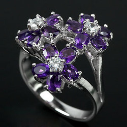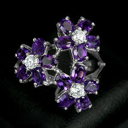ลักษณะ : แหวนเงินประดับพลอยแท้แอเมทิสต์ เป็นพลอยแท้น้ำงาม สีม่วงเข้ม ทั้งหมด 15 ชิ้นทำเป็นดอกไม้ 3 ดอก