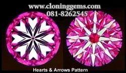 และเราได้นำเข้าเพชรโคลนนิ่งที่มีคุณภาพจากประเทศอเมริกาโดยตรงซึ่งเป็นเพชรที่มีคุณภาพดีที่สุดแตกต่างจากเพชรโคลนนิ่งหรือเพชรสังเคราะห์ที่มีขายอยู่ทั่วไปที่ใช้วัตถุดิบจากจีนหรือเกาหลีที่มีคุณภาพต่ำกว่า และการเจียระไนปกติทั่วไป จะมีเกรดแค่ 1-3 A แต่ของเราเป็นเพชรโคลนนิ่ง Hearts & Arrows ที่มีการเจียระไนที่ดีที่สุด เหลี่ยมสวยที่สุด เปล่งประกายเพชร น้ำงามที่สุด จัดอยู่ในระดับเพชรโคลนนิ่ง Hearts & Arrows เกรด AAAAAA (6A) ที่ได้รับการเจียระไนที่สมบูรณ์แบบมากที่สุด เมื่อนำเพชรสังเคราะห์ทั่วๆไป มาเปรียบเทียบกันด้วยตาเปล่า เราจะสามารถมองเห็นถึงประกายความงามที่แตกต่างได้ทันที ทั้งในด้านการเปล่งประกายความระยิบระยับ การกระจายแสงของเพชร และความสุกใส ส่องสว่าง ที่เหนือกว่าเพชรสังเคราะห์ประเภทอื่นๆ ซึ่งเป็นผลมาจากการพิถีพิถันในการเจียระไนเหลี่ยมของเพชร เพื่อให้ได้ผลลัพธ์ที่สมบูรณ์แบบนั่นเองทั้งในเรืองสัดส่วน ความสมมาตร และการขัดเงา ซึ่งต้องอาศัย ความชำนาญ, ความประณีตและความแม่นยำในการเจียระไน เหลี่ยมเพชร ทุกเหลี่ยมให้ได้ตำแหน่ง ขนาดที่ไม่ผิดเพี้ยน จึงทำให้เพชรที่ทางร้านเลือกใช้ประดับบนตัวเรือนเปล่งประกายสะท้อนความงดงามออกมาได้อย่างเต็มที่ คุณภาพเทียบเท่าเพชรแท้น้ำหนึ่ง ซึ่งมีเครื่องประดับให้เลือกมากมาย และเพชรทุกเม็ดที่เรานำมาคัดลงตัวเรือนมีความใสบริสุทธิ์ ความสะอาดไร้ตำหนิ ระดับสี D ขาวใส และการเจียระไนเหลี่ยม Hearts & Arrows perfect cut สามารถตรวจด้วยกล้องสำหรับส่องเหลี่ยมเพชร Hearts & Arrows หรือเรียกว่า Ideal scope ด้านบนเพชร Table จะสามารถมองเห็นลูกศร หรือ บางคนเรียกลูกธนู 8 ดอก ออกจากจุดศูนย์กลาง ด้านก้นเพชร Culet จะสามารถมองรูปหัวใจ 8 ดวง วิ่งเข้าจุดศูนย์กลาง เห็นเท่าๆกันและ เห็นพร้อมกันครบทุกดวง ซึ่งเพชรของเราเป็นระดับ Excellent รับประกันความสมบูรณ์ทุกเม็ด 100%