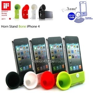 ลำโพง iPhone ดังได้ไม่ง้อ 'แบตเตอรี่' BONE Horn Stand ลำโพงพร้อมขาตั้งในตัวสำหรับ iPhone 4 ที่มีดีไซน์โดดเด่นสไตล์ย้อนยุคแบบเครื่องเล่นจานเสียงโบราณ โดยส่วนประกอบทั้งชิ้นทำจากซิลิโคน เพราะฉะนั้นผู้ใช้ไม่ต้องกังวลเรื่องการเกิดรอยขีดข่วนบนกระจกทั้งด้านหน้า และด้านหลัง เวลาที่ต้องเสียบ iPhone เข้าไป นอกจากนี้ในขณะใช้งาน คุณยังสามารถชาร์จแบตเตอรี่ให้กับ iPhone ได้โดยไม่ต้องถอดมันออกไปก่อนอีกด้วย