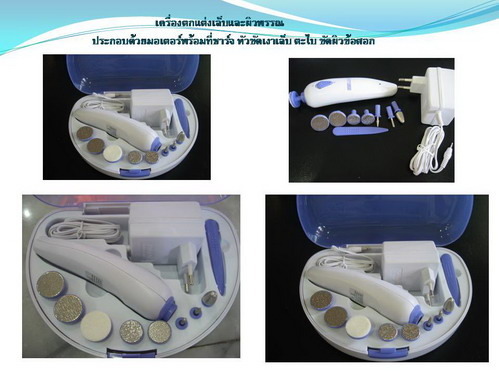 1. ตัวด้าม 2. หัวข้อ 2 แบบ ใช้ขัดหนังที่ด้าน บริเวณข้อศอก หัวเข่า เส้นเท้า เลือกใช้ตามความหยาบกระด้างของอวัยวะ 3. หัวทำความสะอาดขัดถูเล็บให้ดูสะอาดแวววาว 4. หัวขัดตะไบเล็บ 2 แบบ เพื่อจัดทรงเล็บให้เรียวมน เข้ารูปเลือกตามความเหมาะสมของรูปเล็บ 5. หัวขจัดหนังเล็บ รวมถึงขจัดหนังตามซอกเล็บ เลือกตามความเหมาะสมของเล็บ 6. ด้ามแคะเล็บ มี 3 แบบ ชาร์ตด้ามจับเป็นเวลา 24 ซม. ก่อนการใช้งานครั้งแรก บรรจุในกล่องมีคู่มือในการใช้