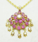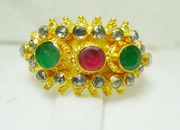 แหวนพลอย 3 สี ทับทิม มรกต เพชรซีก เหลี่ยมลูกโลก แบบงานโบราณ งานสวยปราณีตมาก แหวนวงนี้ฝังทับทิมเจียตรงกลางและฝังมรกตด้านข้างทั้ง 2 ข้าง แบบฝังหุ้ม และล้อมด้วยเพชรซีกเหลี่ยมลูกโลก แบบฝังหุ้ม ทรงโบราณ