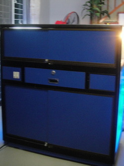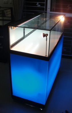 ตู้โชว์จิวเวอรี่สภาพ90% สีน้ำเงิน ทำจ่กอลูมิเนียม มีหลอดไฟ และติดไฟ LEDทั้งตู้ ด้านล่างเปิดไฟได้ มีที่เก็บของด้านหลัง มีล้อ ขนย้ายสดวก(ตัวล๊อคเสีย)