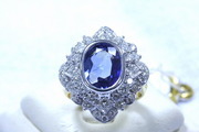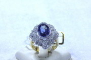 แหวนทองคำแท้ 90% ประดับไพลิน 3 กะรัต ไพลินมีตำหนิบางๆมองด้วยตาเปล่าไม่เห็น(กล้องใช้เลนส์ขยายมาก) ล้อมเพชรเหลี่ยมรัสเซียน คัท น้ำ 96% น้ำหนักรวมของเพชร 1.75 กะรัต น้ำหนักทองคำ 10.2 กรัม ขนาดหน้ากว้าง 2*2.5 ซม