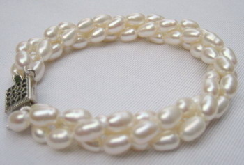 | สร้อยข้อมือมุกข้าวสารสีขาว 3 สาย พันเป็นเกรียว |