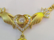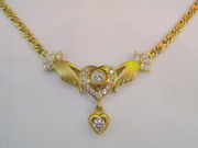ประเภทสินค้า : สร้อยคอ เพชร ทองคำ 90% น้ำหนักพลอยกลาง : 10 ตังค์ 2 เม็ด ชนิดของเพชร : เพชร 8 เม็ดๆละ 2 ตังค์ 13 เม็ดๆละ 3 ตังค์ เพชรเกสร น้ำ 96-97% น้ำหนักเพชรรวม : 0.75 กะรัต น้ำหนักรวมทั้งหมด : 17.5 กรัม