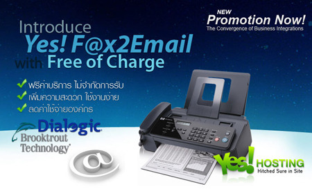 สิทธิพิเศษเฉพาะลูกค้าที่ใช้บริการเว็บโฮสติ้ง สำหรับแพ็คเก็จ Yes! Pro+ Yes! Max+ Yes! Ultimate Yes! 5GB Yes! Elegance Yes! Prestige คุณสามารถแจ้งความประสงค์ขอเปิดใช้บริการ โดยไม่ต้องเสียค่าใช้จ่ายใดๆทั้งสิ้น ตลอดอายุการใช้งานเว็บโฮสติ้ง เมื่อลูกค้าของคุณส่งแฟกซ์ผ่านหมายเลข Fax ID ของคุณ ระบบเซิร์ฟเวอร์จะทำการตรวจสอบ (Verify) และเชื่อมต่อสัญญาณแฟกซ์ จากนั้นจะแปลงข้อมูลเป็นเอกสาร PDF แนบกับอีเมล์ และส่งโดยตรงไปยังกล่องจดหมายของคุณ ข้อดีของ Yes! F@x2Email