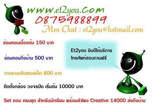 บริการซ่อม อัพเกรด เทรินคอมเก่าแลกคอมใหม่ จัดซื้อ ออกแบบ วางระบบ คอมพิวเตอร์และอินเตอร์เน็ตถึงที่ สนใจติดต่อสอบถาม โทร 0875988899 หรือกด คุยกับช่าง http://www.et2you.com/index.php?option=com_wrapper&view=wrapper&Itemid=103">โดยตรงได้ที่นี่ http://www.et2you.com/">http://www.et2you.com ยินดีให้บริการ