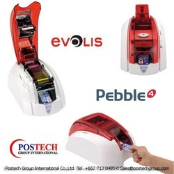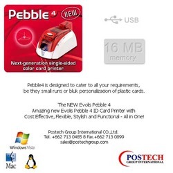 เครื่องพิมพ์บัตรพลาสติก Evolis Pebble 4 เครื่องพิมพ์บัตร Evolis Pebble 4 สามารถ พิมพ์รูปภาพและพิมพ์ บาร์โค๊ด Option Magnetic รองรับการพิมพ์รูปภาพ พิมพ์ บาร์โค๊ดและบันทึกแถบรหัสแม่เหล็กชนิด HICO/LOCO ตามมาตรฐาน ISO7811หรือ JIS2 ได้ Option Smart รองรับการพิมพ์รูป พิมพ์ บาร์โค๊ด และบันทึกข้อมูลลงในบัตรสมาร์การ์ด ตามมาตรฐาน ISO7816-2,PC/SC,EMV 2000-1 Option Contactless รองรับการพิมพ์รูปภาพ พิมพ์ Barcode และสามารถบันทึกข้อมูลลงใน Contactless Card ตามมาตรฐานISO14443A - ISO15693,Mifare,DesFire,HID iCLASS คุณสมบัติทั่วไป ชนิดเครื่องพิมพ์ เป็นเครื่องพิมพ์ ระบบ Dye Sublimaton และ Monochrome thermal transfer สามารถพิมพ์รูปภาพได้ทั้งสี และขาว-ดำ โดยมีความละเอียดของรูปภาพ 300 จุดต่อตารางนิ้ว สามารถต่อเชื่อมได้ Ports USB มาตรฐานและ Ethernet TCP-IP (Option) มีหน่วยความจำภายในตัวเครื่อง 16 MB RAM มีไฟกระพริบแจ้งสถานะ การทำงานของเครื่องพิมพ์และไฟสัญญาณเตือนให้ทำความสะอาดหัวพิมพ์และส่วนต่างๆของเครื่องพิมพ์ มีระบบปรับแต่งค่าสีก่อนพิมพ์ (Enhanced color management system) พิมพ์เต็มบัตรโดยไร้รอยขอบสีขาว (Edge-to-edge printing) มีระบบประหยัดผ้าหมึกพิมพ์ในกรณีทีพิมพ์สีเดียว (Integrated ribbon saver) โดยใช้ Foil ชนิด Monochrome ความเร็ว 150 บัตรต่อชั่วโมง พิมพ์งานเต็มบัตรสีหน้าเดียว (พิมพ์ 1 หน้าใช้ Foil ชนิด YMCKO) ความเร็ว 1000 บัตรต่อชั่วโมง พิมพ์งานข้อความสีเดียวด้านหน้า (พิมพ์ 1 หน้าใช้ Foil ชนิด Monochrome มี Drivers for Windows XP,2003 และ Vista, 32 & 64 bits, Mac OS X v10.2,10.3 และ10.4, Linux ฟรี "eMedia Lite" Software สำหรับออกแบบบัตร คีย์ข้อมูล พร้อมพิมพ์ Barcode และ Logo และสามารถเชื่อมฐานข้อมูลจาก Excel สามารถพิมพ์งานลงในบัตรพลาสติกชนิด All PVC,Composite PVC,PET,ABS and special varnished cardsได้ สามารถพิมพ์งานสีดำลงในบัตรที่เป็นกระดาษได้ โดยใช้ Foil ชนิด BlackWAX Monochrome ฝาครอบเครื่องเป็นรูปเปลือกหอย ทำให้ทำความสะอาดและบำรุงรักษาเครื่องได้ง่าย กล่องใส่บัตร เปลี่ยนง่าย เพียงกดปุ่มเพียง 2 ปุ่มเท่านั้น มีลูกกลิ้งทำความสะอาดบัตรก่อนส่งเข้าเครื่องพิมพ์ มีแหล่งจ่ายไฟอยู่ภายนอกเครื่อง และAdaptor จะต้องได้รับมาตรฐานไฟฟ้า 110 - 230 Volts CA, 50 - 60 Hertz น้ำหนักสุทธิ 5.9 กิโลกรัม (13 ปอนด์) กล่องใส่บัตร ความหนาของบัตรที่ใช้พิมพ์ กล่องบรรจุบัตรขาเข้า กล่องรับบัตรที่พิมพ์เสร็จ 0.25 mm. (10 mil) to 1 mm. (40 Mil)