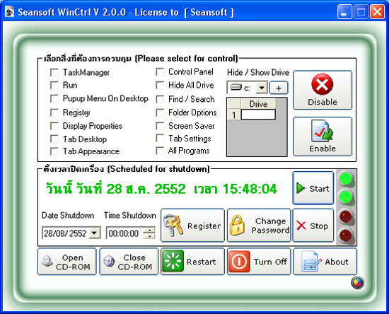 โปรแกรม Seansoft Winctrl 2.0 (ตั้งวัน-เวลาปิดเครื่อง,ซ่อนไดว์ฟ A-Z, ซ่อน Run,Registry,Control Panel)