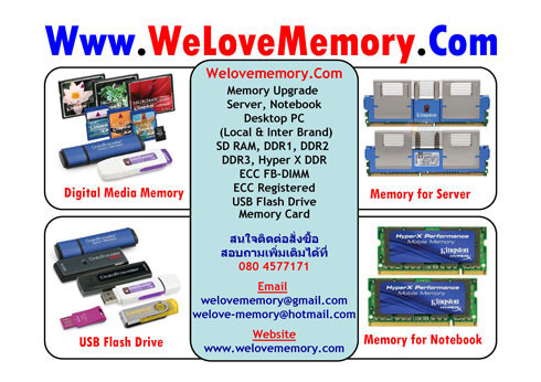 เว็บ Online : WeLoveMemory.com : จำหน่ายแรม RAM Server,RAM Workstation,Notebook,Desktop PC,Hyper X,ECC FB-DIMM,Registered,Flash Drive,Memory Card,SSD Drive,Bluetooth Headset,External Hard Disk,Hard D