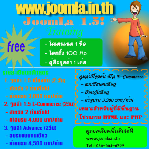 ดูรายละเอียดเพิ่มเติมได้ที่ http://www.joomla.in.th/v1/images/stories/logotraining9-51-1.jpg พิเศษ สำหรับผู้ที่รับบริการจดเว็ปและใช้งานโฮ้ส.. Domain.. [.com,.net,org] + 100 MB + ระบบที่ท่านต้องการ
