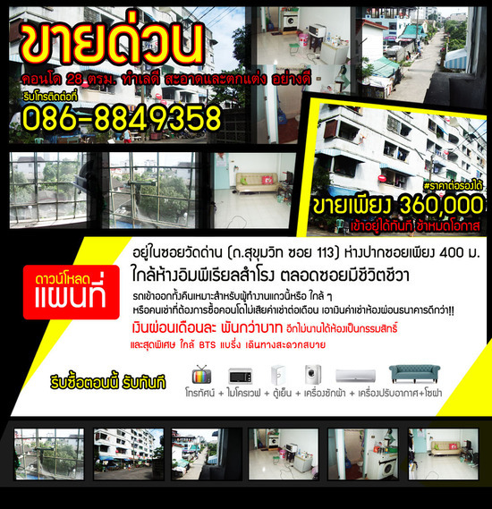 ขายคอนโด ห่างจากปากซอยวัดด่าน ( ซ.113 ) ถนนสุขุมวิท เพียง 400 เมตร