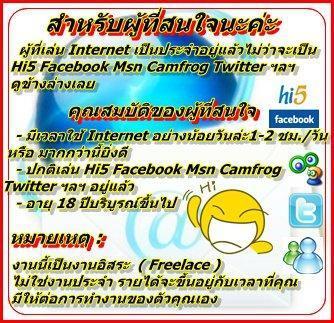 ผู้ที่ต้องการ หางาน ทำที่บ้าน ผ่านเน็ต รายได้ดี ที่มีรายได้ทุกๆวัน จากการใช้ เวลาว่่างที่บ้านทำงานผ่านเน็ต โดยใช้เวลาเพียง 2-3 ชั่วโมงต่อวัน หลังเลิกเรียน สำหรับ นักเรียน นักศึกษา หลังเลิกงาน สำหรับ ผู้ที่ทำงานประจำ ผู้ที่สนใจ หางาน ทำที่บ้าน ผ่านเน็ต รายได้ดี เพื่อเป็น รายได้เสริม รายได้พิเศษ เชิญดูรายละเอียดคะ คุณสมบัติ ของผู้ที่ต้องการ หางาน ทำที่บ้าน ผ่านเน็ต รายได้ดี - ชาย/หญิง อายุ 18 ปี ขึ้นไป