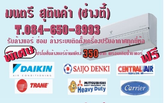ล้างแอร์ ราคาถูกสุดๆ พร้อมโปรโมชั่นพิเศษ ล้างเพียง 350 บาทเติมน้ำยาแอร์ฟรี ล้างด้วยระบบอัดฉีดน้ำแรงดันสูง พร้อมฉีดน้ำยาฆ่าเชื้ออย่างดี