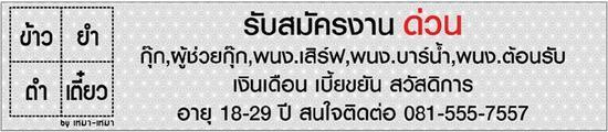 รับสมัครงาน ด่วน กุ๊ก, ผู้ช่วยกุ๊ก, พนง.เสิร์ฟ, พนง.บาร์น้ำ, พนง.ต้อนรับ Tel. 081-555-7557