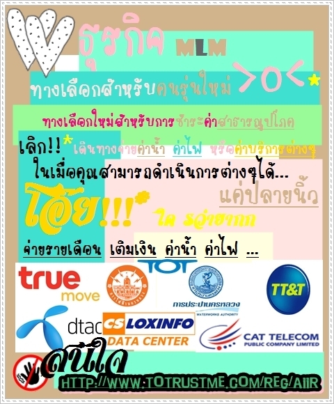 ***เป็น บริการที่นำไปใช้เติมเงินโทรศัพท์/บัตรเงินสด/เกมส์ออนไลน์/ชำระค่าสารณูป โภคต่างๆได้ในอนาคตจะกลายเป็นสิ่งที่ทุกครอบครัวต้องใช้บริการนี้ ....มันจึงจะเป็นธุระกิจที่จะมาแรง...เพราะนำระบบการปันผลคืนผู้บริโภคมาใช้ซึ่งไม่เคยเกิดขึ้นมาก่อนเป็นการนำการตลาดmlm.(ระบบสมาชิก+ธุรกิจการบริการ)มาใช้...นั่นเอง ***มันจึงเป็นโอกาสที่คุณจะพลาดไม่ได้ที่จะเข้ามามีส่วนแบ่งทางการตลาดนี้เสียแต่เนิ่นๆ ก่อนที่คนอื่นเขาจะนอนตีพุงกันแล้ว..........