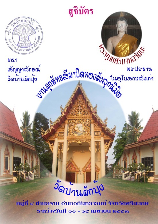 ทางวัดบ้านผักบุ้ง หมู่ ๔ ตำบลจาน อำเภอกันทรารมย์ จังหวัดศรีสะเกษ ได้สร้างอุโบสถเสร็จเรียบร้อยแล้ว จึงได้กำหนดงานผูกพัทธสีมาปิดทองฝังลูกนิมิต ระหว่างวันที่ ๑๐ เมษายน ๒๕๕๓ ถึง ๑๔ เมษายน ๒๕๕๓