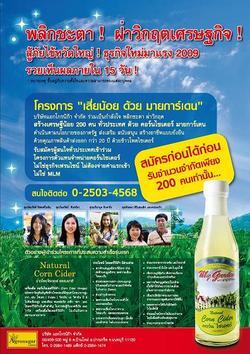 บริษัทแอกโกรนิก้า จำกัด ผุดโครงการสร้างเศรษฐีน้อย 200 คน ทั่วประเทศ ด้วยคอร์นไซเดอร์ พลิกวิกฤต สร้างชีวิตใหม่ให้ คนตกงาน หรือ คนที่มีใจเต็มร้อย ที่พร้อมจะเติบโตไปกับบริษัท อย่างมั่นคง แบบยั่งยืน ในสภาพเศรษฐกิจปัจจุบันที่มีคนตกงานจำนวนมาก เนื่องจากหลายผู้ประกอบการจำนวนมาก ได้ปิดตัวลง จากภาวะเศรษฐกิจโลกถดถอยอย่างหนักที่ช่วง 2-3 ปีที่ผ่านมา ผู้บริหารของบริษัทแอกโกรนิก้า จำกัด นำโดย คุณเทียนชัย ปิ่นวิเศษ CEO ของบริษัท ปรารถนาจะ สร้างโอกาส สร้างงาน สร้างคน ให้คนไทย ที่มีหัวใจเต็มร้อย พร้อมที่จะร่วมเติบโตไปกับบริษัท ซึ่งบริษัทเป็นผู้ผลิตและผู้ส่งออกมากว่า 20 ปี โดยรับสมัครเพียง 200 คน จากทั่วประเทศ เพื่อเป็นศูนย์กระจายสินค้า คอร์นไซเดอร์ ประจำจังหวัดๆ ละ 1 คน เท่านั้น โดยบริษัทจะเป็นผู้สนับสนุนด้านการตลาด และให้คำปรึกษา ซึ่งจะอยู่เบื้องหลังความสำเร็จของผู้เข้าร่วมโครงการทุกท่าน นำผลิตภัณฑ์คอร์นไซเดอร์ สู้ภัยไข้หวัดใหญ่ คืนสุขภาพที่ดีให้แก่ชาวไทย ซึ่งในสมัยกรีก 460 ปี ก่อน คริสต์ศักราช บิดาการแพทย์แผนปัจจุบัน ฮิปโปเครตีส ( Hippocrates ) ได้ใช้ “ไซเดอร์ ผสม น้ำผึ้ง รักษาและป้องกันโรคหวัด และโรคต่างๆมากมาย บริษัทแอกโกรนิก้า ผู้ผลิตและจดอนุสิทธิบัตรทรัพย์สินทางปัญญา คอร์นไซเดอร์ ซึ่งมากด้วยคุณประโยชน์นานัปการ พิสูจน์และเห็นผลได้ มาร่วมสร้างสุขภาพที่ดีให้แก่ชาวไทย ทั้งประเทศ ธุรกิจอาหารเพื่อสุขภาพ ปัจจุบันขยายตัวอย่างรวดเร็ว คอร์น ไซเดอร์ เป็นอีกหนึ่งผลิตภัณฑ์ฝีมือคนไทย ซึ่งเป็นน้ำสกัดจากข้าวโพดอ่อน ซึ่งปัจจุบันผู้คนหันมาให้ความสนใจเกี่ยวกับการดูแลสุขภาพกันมากขึ้น ธุรกิจด้านสุขภาพกำลังเติบโตไปในทิศทางที่ดีขึ้นทั้งนี้ ทางบริษัทฯทราบดีว่า บริษัทเป็นบริษัทผู้ส่งออกข้าวโพดอ่อน อันดับหนึ่งของประเทศ จึงได้มีการวิจัยและสร้างผลิตภัณฑ์ หรือเรียกว่าการต่อยอดผลิตภัณฑ์จากข้าวโพดอ่อน จึงได้ทำการผลิตคอร์นไซเดอร์ขึ้นมา เป็นสินค้าประเภทเครื่องดื่มเพื่อสุขภาพ โดยบริษัทแอกโกรนิก้า จำกัด มีโครงการสร้างเศรษฐีน้อย ทั่วประเทศ ด้วยคอร์นไซเดอร์ พลิกวิกฤต สร้างชีวิตใหม่ให้คนตกงาน หรือคนที่มีใจเต็มร้อยที่จะพร้อมเติบโตไปกับบริษัทอย่างมั่นคงและยุ่งยืน บริษัท แอกโกรนิก้า จำหน่ายเครื่องดื่มเพื่อสุขภาพ Natural Corn Cider ข้าวโพดอ่อนไซเดอร์หมักจากธรรมชาติตรา My Garden เครื่องดื่ม Corn Cider Vinegar สกัดจากวัตถุดิบ ธัญพืช ข้าวโพดอ่อน ที่มีคุณค่าทางโภชนาการสูง ซึ่งอุดมไปด้วยสารอาหาร เช่น โฟเลท (Folate) วิตามิน A วิตามิน B6 โปแตสเซียมสูง แคลเซียม ฟ