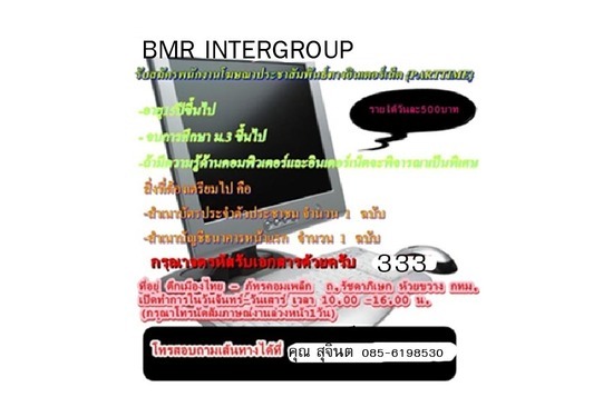 รายได้ขึ้นอยู่กับปริมาณงานที่ทำได้ ถ้าขยันมากก็ได้มาก หลักฐานในการสมัคร 1. สำเนาบัตรประชาชน –รหัสขอไฟล์งาน 333 2. เลขที่บัญชีธนาคารกรุงเทพ /ธนาคารอื่นๆ สวัสดิการ -มีประกันภัยอุบัติเหตุให้ฟรี สนใจติดต่อ โทร คุณสุจินต์ 027340499,085-6198530