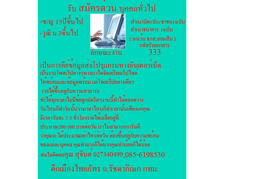 รายได้ขึ้นอยู่กับปริมาณงานที่ทำได้ ถ้าขยันมากก็ได้มาก หลักฐานในการสมัคร 1. สำเนาบัตรประชาชน –รหัสขอไฟล์งาน 333 2. เลขที่บัญชีธนาคารกรุงเทพ /ธนาคารอื่นๆ สวัสดิการ -มีประกันภัยอุบัติเหตุให้ฟรี สนใจติดต่อ โทร คุณสุจินต์ 027340499,085-6198530