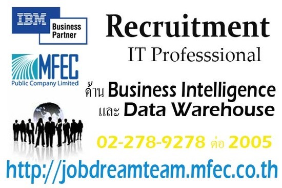 โอกาสทำงานด้าน Data Warehouse / Business Intelligence กับ MFEC http://jobdreamteam.mfec.co.th/">http://jobdreamteam.mfec.co.th IBM ขอเชิญผู้มองหางานด้านไอที งาน Data Warehouse หรือ งาน Business Intelligence เชิญร่วมพิสูจน์ศักยภาพและความสามารถ เพื่อเข้าทำงานกับ Solution Partner ชั้นนำของเรา MFEC และ BAC ในหลากหลายตำแหน่งงาน อาทิ Business Analyst,