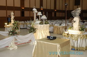 น้ำแข็งแกะสลัก 1 ก้อน , ดอกไม้ประดับโต๊ะน้ำแข็ง , เค้กแต่งงาน 5 ชั้น , ดอกไม้ประดับโต๊ะเค้ก ,
