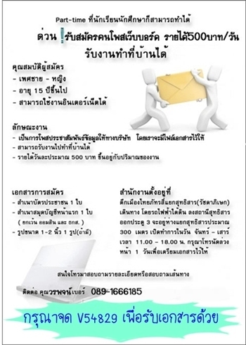 รับสมัครด่วน!!! คนโพสข้อความประชาสัมพันธ์ทางเว็บไซต์ + ส่งเมลล์ รายได้วันละ 500 บาท