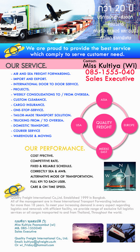 ค่าขนส่ง ราคาพิเศษ ทางเรือ ทางแอร์ ทั้งนำเข้า และ ส่งออก สินค้าจากประเทศ จีน ฮ่องกง อเมริกา และ ทั่วโลก เรามี AGENT ทั่วโลก ไว้สำหรับบริการทั้งแบบ FOB , CIF, DOOR TO DOOR ด้วยประสบการณ์ กว่า 20 ปี ของ Quality Freight International Co., Ltd. และ ได้รับความไว้วางใจจากลูกค้าจำนวนมาก เรา คือ ผู้ให้บริการทั้ง ส่งออก และ นำเข้า สินค้า ทางเรือ ทางแอร์ และ ชิปปิ้ง ด้วยประสพการณ์ ของทีมงาน และ การบริการที่ดีเยี่ยมของเรา เรายินดีก้าวไปสู่ความสำเร็จกับคุณ กุณฑิยา พูลสมบัติ (วิ) 085 155 5040 Miss Kultiya Poonsombut (wi)
