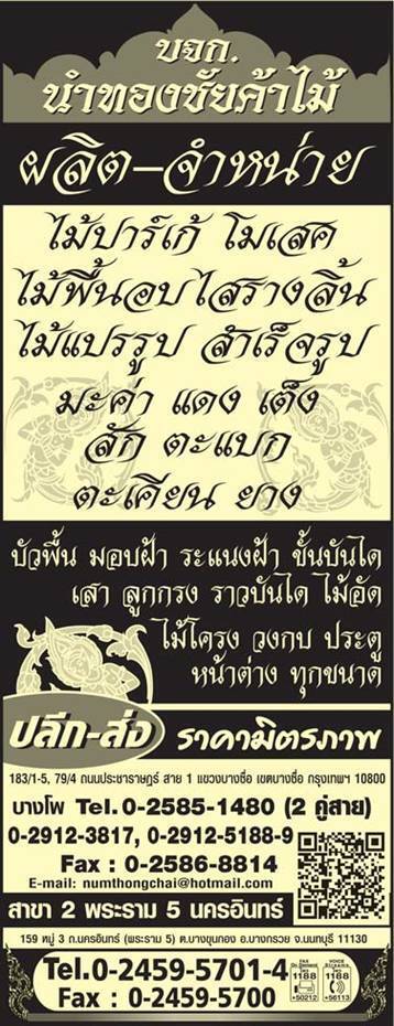 สอบถามราคาและรายละเอียดสินค้าเพิ่มเติมได้ที่ คุณ ปิยะภัสร์ 081 734 6765 . บริษัท นำทองชัยค้าไม้ จำกัด 159 หมู่ 3 นครอินทร์ ตำบลบางขุนกอง อำเภอบางกรวย นนทบุรี 11130 Tel: 02-459-5701-4 Fax: 02-459-5700 Email: [email protected] http://www.ขายไม้ค้าไม้.com/">ขายไม้, ค้าไม้, ร้านขายไม้