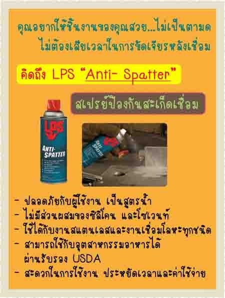 LPS ANTI-SPATTER สเปรย์ป้องกันสะเก็ดเชื่อมติดกับชิ้นงานไม่มีสารเป็นพิษเจื่อปนไม่มีส่วนผสมของซิลิโคน ไม่ติดไฟ ใช้ป้องกันสะเก็ดเชื่อมของ stainlessได้ดีสอบถามรายละเอียดเพิ่มเติมได้ค่ะ