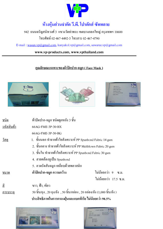 หน้ากากปิดจมูกอนามัย ราคา 0.95/ชิ้น แบบ 3 ชั้น ผ่านการทดสอบ Nelson Lap ผลิตประเทศไทย ติดต่อ VP Products Tel 02-467-4492-3 , 02-868-2211