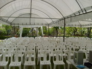 ให้เช่าโต๊ะกลม โต๊ะสี่เหลี่ยม เก้าอี้พลาสติก เก้าอี้เบาะนวมคลุมผ้าสีขาวผูกโบว์ทอง