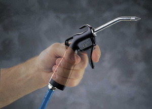 ด้ามจับทำจากวัสดุ ABS ซึ่งมีน้ำหนักเบา แต่มีความแข็งแรงทนทาน ด้ามจับกระชับมือ มีอายุการในการใช้งานนาน ไม่มีลมรั่ว ในการใช้งานสภาวะปกติ ไกปืนมีลักษณะสั้นและนิ่ม สามารถใช้งานด้วยนิ้วเพียงนิ้วเดียว ช่วยลดความเมื่อยล้าเมื่อใช้งานเป็นระยะเวลานาน วัสดุปลายปืนทำมาจาก SWEDEN ZINC มีลักษณะเป็นร่องเพื่อ ให้ลมออกก่อนเพื่อลดปริมาณลมและความดันของลมลง ออกแบบให้มีความปลอดภัยต่อมนุษย์โดยตรง หากต้องสัมผัสกับร่างกายมนุษย์ โดยตรงความดันที่สัมผัสไม่เกิน 2.4 กิโล แรงลมที่ออกจากปลายปืนไปกระทบวัตถุ มีความแรง 3.2 N (ที่ Air Supply Pressuer 5 bar) ในระยะห่าง 10 เซนติเมตร จากวัตถุ ใช้พลังงานลมเพียง 19 Nm3/h ช่วยประหยัดพลังงานลม