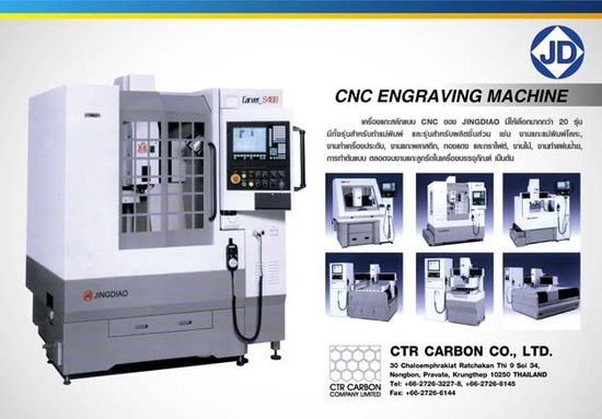 บริษัทฯ เป็นตัวแทนจำหน่าย และให้บริการ เครื่องจักร CNC Engraving Machine ยี่ห้อ JINGDIAO จากประเทศจีน แต่เพียงผู้เดียวในประเทศไทย ผลิตภัณฑ์ของ JINGDIAO เป็นเครื่องจักร CNC ประเภท เครื่องแกะสลักลวดลาย(CNC Engraving Machine) สำหรับแกะสลัก ตัวหนังสือ โลโก้สัญลักษณ์ การทำแม่พิมพ์ขนาดเล็ก ขึ้นรูป3D และเก็บละเอียด (Finished) สามารถใช้กับวัสดุได้หลายประเภท เช่น ทองแดง ทองเหลือง กราไฟท์ เหล็ก อลูมิเนียม อะครีลิค ไม้เทียม ไม้ ฯลฯ บางรุ่นเป็นเครื่องที่มีโครงสร้างแข็งแรง สามารถกัดงานโลหะแบบเดียวกับ High Speed Milling ได้เป็นอย่างดี นอกจากการขาย เรายังมีบริการด้านการฝึกอบรม (Training) และบริการหลังการขาย (Service) ด้วยรถบริการที่พร้อมไปด้วยอะไหล่สำรอง และช่างเทคนิค ที่ได้รับการฝึกอบรมจากโรงงานผู้ผลิต และมีความเชี่ยวชาญในการให้บริการ บริษัทฯ หวังเป็นอย่างยิ่งว่าจะได้รับความไว้วางใจจากท่าน ในการเลือกใช้เครื่องจักรของ JINGDIAO เพื่อเป็นเครื่องมือในการสนับสนุนกำลังการผลิตของท่านโปรดสอบถามรายละเอียดเพิ่มเติมได้ที่