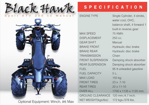 Sport ATV รุ่น Blackhawk ขนาด 250 cc เกียร์ manual 5 speed ระบายความร้อนด้วยน้ำ ดีไซน์โฉบเฉี่ยว เฟรมใหญ่ แข็งแรง ทนทาน โช็คหลังมีกระเดื่องลดแรงกระแทก Disc Brake หน้า- หลัง เป็น ATV ที่มีสมรรถนะดีเยี่ยม แต่ราคาถูก อย่างไม่น่าเชื่อ กับคุณภาพระดับนี้ เครื่องยนต์ เหนียว ลุยทางวิบากได้ดีเยี่ยม ฐานล้อหน้ากว้าง เข้าโค้ง และลุยทางลาดชันได้ดี