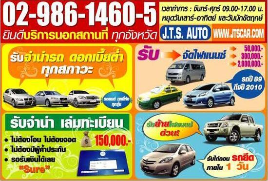รับจัดไฟแนนซ์ จำนำทะเบียน จำนำจอด ซื้อขาย แลกเปลี่ยนรถยนต์ ปิดบัญชี ไถ่รถยึด ไม่เช็ค Black listดอกเบี้ยถูก รับเงินภายใน 1 วัน เงื่อนไขไม่ยุ่งยาก เวลาทำการ จันทร์ เสาร์ เวลา 9.00-17.00 น. ดูรายละเอ