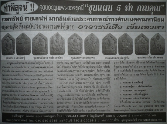ถ้าพูดถึงเครื่องรางที่เป็นที่นิยมเป็นที่รู้จักเป็นอย่างดีของทุกคน แน่นอนคงไม่พ้น พระเครื่องขุนแผน ซึ่งใครถ้ามีไว้ในครอบครองย่อมเป็นคนเหนือคน ยอดของสุดยอดมหาเสน่ห์ที่ใครๆก็ปรารถนาจะมีติดไว้บูชาสักองค์ ยิ่งปลุกเสกจัดสร้างจากจอมขมังเวทยอดเกจิอาจารย์ฆราวาสอย่างท่านอาจารย์เสือ เข็มเทวดาแล้วนั้น รับประกันความแรงเป็นร้อยเท่า พันเท่าแน่นอน ขุนแผนจากที่ไหนแขวนแล้วไม่ถูกใจ ไม่แรง ลองมาสัมผัส ขุนแผน 5 ท่า กามคุณ ของท่าน อาจารย์เสือ เข็มเทวดา แล้วนั้นจะได้รู้ว่าเสน่ห์แรงถึงใจแบบสัมผัสได้เป็นอย่างไร ด้วยมวลสารที่ครบถ้วนชั้นแนวหน้าทางด้านเสน่ห์ที่รวบรวมมาจนมากล้นอันแน่นกันอยู่ในองค์ขุนแผน 5 ท่า กามคุณทั้ง 5 แบบที่แรงจนเกินบรรยาย เข้มข้น เข้มขลัง ทั้งผงพรายนารีตายท้องกลม ตายวันเสาร์ เผาวันอังคาร ผงพรายกุมารที่มีมาใส่กันแบบเป็นถังๆ ที่ท้าให้ส่องดูเต็มๆตาว่าเนื้อหาเข้มข้นอัดแน่นเห็นมวลสารชัดเจนทุกอณูจริงๆ อีกทั้งร่วมด้วยเจิมหัวเชื้อน้ำมันพรายแท้ๆผสมแบบเนื้อๆทุกๆองค์ ถ้าไม่ขลัง ไม่แรง ไม่รู้จะว่าอย่างไร ซึ่งขุนแผนชุดนี้ได้ประกาศศักดาแล้วว่าประสบการณ์แรงจริงๆ จากที่มีศิษย์ทั้งหลายได้บูชาติดตัว ต่างบอกเป็นเสียงเดียวกันว่า อยากได้อะไร ก็ขอได้ดั่งใจจริงๆ แค่กำไว้ในมือ อธิษฐานจิตให้มั่นเท่านั้น อยากได้อะไร ขอได้ทุกอย่าง จะขอให้จีบสาว ก็เดินไปจีบได้เลยไม่พลาด จะติดตัวแขวนไปทำการค้าขาย ติดต่อธุรกิจก็มีแต่คนเมตตายอมตกลงเจรจาด้วยดี หรือจะเป็นพรายกระซิบช่วยระแวดระวังป้องกันภัยก็พึ่งได้ ดีรอบด้าน ตามฉบับเครื่องรางของท่านอาจารย์เสือ เข็มเทวดา ที่ไม่เคยทำให้ใครผิดหวังแน่นอน พิสูจน์ความแรงเกินห้ามใจ จากขุนแผน 5 ท่า กามคุณ ทั้ง 5 แบบได้แล้ว ซึ่งแต่ละแบบแต่ละพิมพ์ล้วนมีความแตกต่างกันไปตามสาย บูชาได้ตามที่ถูกใจ มี 5 พิมพ์ 5 ท่าให้เลือก