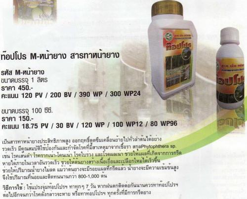 สารทาหน้ายางประสิทธิภาพสูง สารทาหน้ายางประสิทธิภาพสูง ป้องกันกำจัดโรคจากเชื้อรา สกุล phytophthera sp. รักษาแผลที่เกิดจากรอยกรีดได้รวดเร้ว สร้างเนื้อเยื่อและเปลือกใหม่ได้เร็วขึ้น ปริมาณน้ำยางไม่ลด มีความเข้มข้นสูง ใช้ปริมาณน้อยและติดทน ราคา 490 บาท/1 ลิตร สนใจติดต่อ คุณพล-0880091734, 084-0325869 http://public.bookmax.net/psook/bookmarks http://wisdom9999.blogspot.com ถ้าสนใจสมัครสมาชิก เอกสาร สมัครงาน - สำเนาบัตรประชาชน - สำเนาบัญชีธนาคารหน้าแรก{ยกเว้น ธ.ออมสิน,ธกส} - รหัสรับเอกสาร F133916 สนใจติดต่อ คุณอัยย์ลดา Tel. 0859335437 , 0847999897 , 0896229979