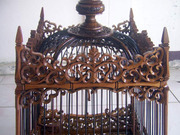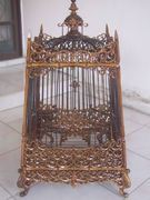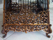 กรงและอุปกรณ์เป็น ไม้สักแกะลายทั้งหมด ฝังหมุดไม้ ทั้งใบ ซี่เป็นไม้ขาวดำ