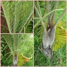 เป็นปาล์มที่มีลักษณะลำต้นเดี่ยว สูงได้ถึง 5-6 เมตร เมื่อต้นเล็กลำต้นจะมีลักษณะเป็นสามเหลี่ยมสี่ม่วงคล้ำ ก้านใบสีเหลือง เมื่อต้นใหญ่จะลำต้นกลมป่องตรงกลางทรงเหมือนขวดน้ำ ทนอากาศหนาว และ ทนเค็มได้ดี