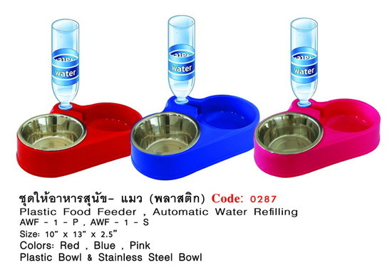 ชุดให้อาหารและน้ำสำหรับสุนัข ผลิตจากพลาสติกอย่างดี มีชามแสตนเลสสำหรับใส่อาหาร และมีขวดน้ำสำหรับให้น้ำอัตโนมัติ เมื่อสุนัขรับประทานน้ำในชาม น้ำจะไหลลงมาเพิ่มจากในขวด ทำให้สุนัขมีน้ำรับประทานตลอดทั้งวัน สินค้ามีสี แดง ฟ้า และ ชมพู (ไม่รวมขวดน้ำ) สามารถใช้ได้กับขวด น้ำอัดลม และ ขวดที่มีคอขวดเล็ก