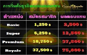 งานออนไลน์ ได้เงินจริง ทำได้ง่ายๆ ทำได้ทุกคน ไม่เชื่อก็ต้องเชื่อ!!! http://grithailand.com/?id=85">GRI ภายใต้แนวความคิดนวัตกรรมใหม่ รูปแบบการทำงานที่แตกต่าง ผสมผสานกับเทคโนโลยีที่สมบูรณ์แบบ จึงก่อให้เกิดสิ่งนี้ขึ้นมา GrandRoyale ระบบที่จะเปลี่ยนโลกนี้ไปอย่างสิ้นเชิง 1. ธุรกิจยักษ์ใหญ่ มั่นคง มีออฟฟิศในไทย รับรายได้ตรงเข้าธนาคารไทย เปิดตัวในไทย 01/05/53 ที่อยู่ในไทย เดอะ แกรนด์อยุธยา กรุงเทพ 20 ถ.รัชดาภิเษก 18 แขวงห้วยขวาง เขตห้วยขวาง กรุงเทพมหานคร 10310TEL. 02-998-0526 ที่อยู่สำนักงานใหญ่ ฮ่องกง27/F Metropolis Tower 10 Metropolis Drive, HongHam,Kowloon HK. 2. แผนรายได้ แหวกแนวแผนไบนารี่ทั่วไป 2.1 Random Matching 100% จากองค์กรทั่วโลก 2.2 GOD OF FORTUNE ก็คือ ป้ายรางวัล และสุ่มตัวเลขคูณ ให้สมาชิกทุกสัปดาห์ 2.3 แผน เน็ทเวิร์ค เกิดจากการขยายสายงาน สร้างองค์กร ,ค่าแนะ ,จับคู่จ่าย ,ยอดขายทั่วโลก ,คนขยัน 3. สมัครแล้ว แนะนำสมาชิกไม่ได้ มีแผนช่วยเหลือ 3.1 ระบบหมุนเวียนสมาชิกทั่วโลกมาต่อให้เราทุกวันอาทิตย์ตอนเย็น 1 คน ลุ้นทุกวัน ครบ 7 วัน เปลี่ยนคนใหม่ 3.2 รับแมชชิ่ง 100% จากระบบหมุนเวียนสมาชิก เขามีรายได้เท่าไหร่เรารับ 100% แต่จะไม่เกิน 2500 ต่อวัน Basic 3.2 มีตัวช่วย สุ่มตัวเลขให้สมาชิก หากได้ เลข 2 เอา 2 คูณ กับยอดเงินที่ได้ในครั้งนั้น ก็จะได้ยอดเงินจริงเห็นๆ 3.3 รางวัลเปิดป้ายยอดเงิน ทุกสัปดาห์ ( 940 บาท ) (4,440 บาท ) ( 9,440 บาท ) ( 44,440 บาท ) รับทันที 4. การสมัครเริ่มต้นลงทุนต่ำ Besic 1,250 มีให้เลือก 4 ตำแหน่ง 4.1 Basic ลงทุน 1,250 รับสูงสุด 2,500 ต่อวั 4.2 super ลงทุน 6,250 รับสูงสุด 12,500 ต่อวัน 4.3 Premium ลงทุน 18,750 รับสูงสุด 37,500 ต่อวัน 4.4 Royale ลงทุน 37,500 รับสูงสุด 75,000 ต่อวัน ตำแหน่งนี้จะรับรายได้ ไม่จำกัด จับคู่จ่าย 50,000 ต่อคู่ 5. จ่ายครั้งเดียว ไม่รักษายอด ไม่ตัดยอดจำหน่าย ไม่บังคับซื้อสินค้า 5.1 สินค้าทั่วไปแนว MLM เครื่องสำอาง มือถือ โน๊ตบุ๊ค อาหารเสริม เครื่องดื่ม นาฬิกา เป็นต้น 5.2 สินค้าในประเทศ ( ประกันชีวิต ) ไทยพาณิชย์นิวยอร์คไลฟ์ ทำได้ทุกตำแหน่ง 6. สมัครแล้วสามารถอัพเกรดตำแหน่งสูงได้ 6.1 การอัพเกรดเลื่อนตำแหน่งจะไม่มีสินค้าตอบแทน จะได้ครั้งแรกที่อัพเกรดเท่านั้น 6.2 หากต้องการสมัครควรตัดสินใจเลือกตำแหน่งที่ท่านลงทุนได้ เพื่อสิทธิในการรับสินค้าตอบแทน(แนะนำตำแหน่งสูง) 7. จ่ายผลประโยชน์สูงสุด 87.50% คำนวณรายได้ บาทต่อบาท ไม่มี PV GRI เป็นธุรกิจที่สามารถทำงานออนไลน์บนโลกอินเทอร์เน็ตได้ 100% และบริษัทมีความมั่นคงสูง GRI เป็น ธุรกิจที่มีแผนการตลาดที่ยอดเยี่ยม เปิดรหัสครั้งเดียว ไม่ต้องรักษายอด โตข้างเดียวก็มีรายได้ GRI เป็นธุรกิจที่มีความเสี่ยงน้อย เพราะลงทุนต่ำ ผลตอบแทนสูง ระยะเวลาคืนทุนเร็ว