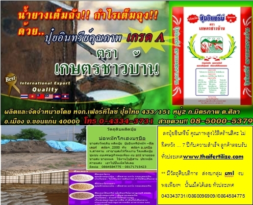ติดต่อ 043343731//0860096909//0864584775/0850005379 น้ำยางเต็มถัง....กำไรเต็มถุง!! ด้วยปุ๋ยอินทรย์คุณภาพเกรด A ตรา เกษตรชาวบ้าน ลงปุ๋ยอินทรีย์ไว้ติดร้านสิค่ะ ไม่ผิดหวัด.....7 ปีกับความสำเร็จลูกค้าตอบรับกันทั่วประเทศ http://www.thaifertillize.com/">www.thaifertillize.com มีวัตถุดิบบริการ ส่งกลุ่ม SML งบพอเพียงฯ ปั้นเม็ดได้เลย ทั่วประเทศ ติดต่อ่สอบถามเพิ่มเติมได้ที่ 043343731//0860096909/